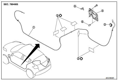 7. Remove fuel filler lid opener cable from fuel filler lid lock assembly. Refer to DLK-349, "FUEL FILLER LID LOCK : Removal and Installation".