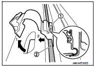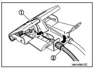 4. Disengage fuel filler lid opener cable (1). Remove fuel filler lid opener cable while pressing stopper pin (2).