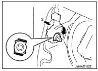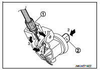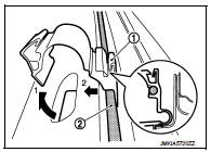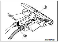 4. Disengage fuel filler lid opener cable (1). Remove fuel filler lid opener cable while pressing stopper pin (2).