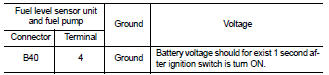 5. Check voltage between “fuel level sensor unit and fuel pump” harness connector and ground.