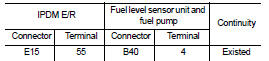 2. Check the continuity between IPDM E/R harness connector and “fuel level sensor unit and fuel pump” harness connector.