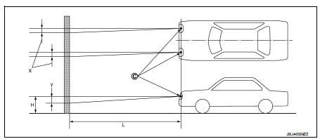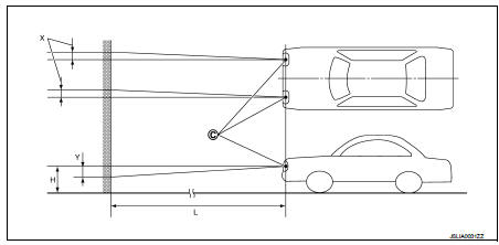 2. Face the vehicle squarely toward the screen and make the distance between the headlamp center and the screen 10 m (32.8 ft).