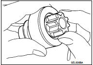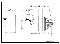 • With pinion driven out by magnetic switch, push pinion back to remove slack and measure clearance “L” between the front edge of the pinion and the pinion stopper.