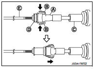 4. Press the pawls (B) of the key interlock cable slider (A) while sliding it in the direction of the casing cap (C), and separate the adjusting holder (D) and slider.