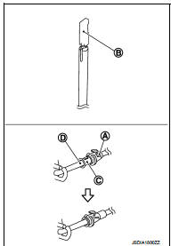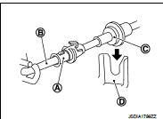 • While pressing the detent rod (B) down, slide the key interlock cable slider (A) toward the key interlock rod (D) side, and install the adjusting holder (C) and key interlock rod.