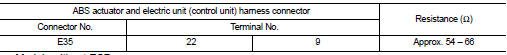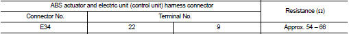 2. Check the resistance between the ABS actuator and electric unit (control unit) harness connector terminals.
