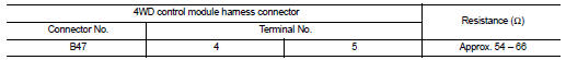 2. Check the resistance between the 4WD control module harness connector terminals.