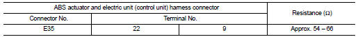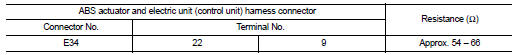 2. Check the resistance between the ABS actuator and electric unit (control unit) harness connector terminals.