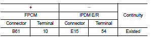 3. Check the continuity between FPCM harness connector and IPDM E/R harness connector.