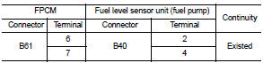 2. Check the continuity between FPCM harness connector and fuel level sensor unit (fuel pump) harness connector.