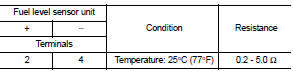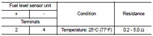 3. Check resistance between fuel level sensor unit terminals as follows.