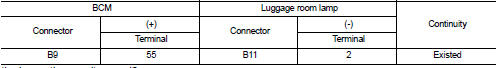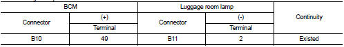 2. Check continuity between BCM harness connector and luggage room lamp harness connector.