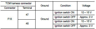 Check the following items: • Open or short circuit of the harness between battery positive terminal and TCM connectors terminals 45 and 46. Refer to PG-10, "Wiring Diagram - BATTERY POWER SUPPLY -".