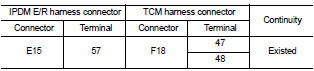 3. Check continuity between IPDM E/R harness connector terminal and TCM harness connector terminals.