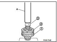 b. Remove 3rd main gear, busing, 2nd main gear, 2nd inner baulk ring, 2nd synchronizer cone, 2nd outer baulk ring, 1st-2nd synchronizer hub assembly, 1st outer baulk ring, 1st synchronizer cone, 1st inner baulk ring, and 1st main gear, using the drift (A) [SST: ST33052000].