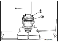 2. Remove 6th main gear (1) and mainshaft rear bearing inner race (2), as per the following procedure.
