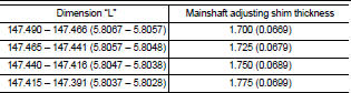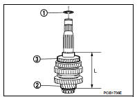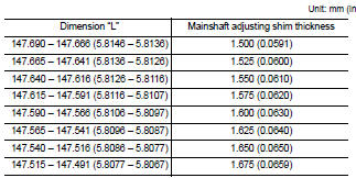 7. Measure dimension “L” as shown in the figure. Select mainshaft adjusting shim (1) according to the following list, and then install it to mainshaft.