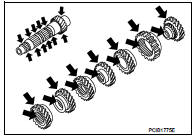 2. Apply gear oil to 1st inner baulk ring, 1st synchronizer cone, 1st outer baulk ring, 2nd inner baulk ring, 2nd synchronizer cone, and 2nd outer baulk ring.