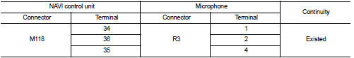 3. Check continuity between NAVI control unit harness connector and microphone harness connector.