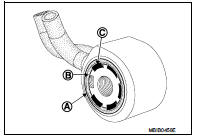 • Replace the O-ring (A) of the oil cooler, positioning the lip (B) of the seal behind the lug (C) of the oil cooler.