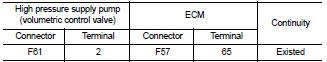 3. Check the continuity between high pressure supply pump (volumetric control valve) harness connector and ECM harness connector.