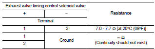 3. Check resistance between exhaust valve timing control solenoid valve terminals as per the following.