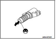 2. Provide 12 V DC between exhaust valve timing control solenoid valve terminals 1 and 2, and then interrupt it. Check that the plunger moves as shown in the figure.