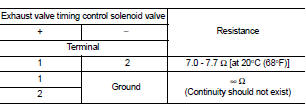 3. Check resistance between exhaust valve timing control solenoid valve terminals as per the following.