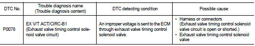 Check the exhaust valve timing control solenoid valve. Refer to EC-586, "Component Inspection".
