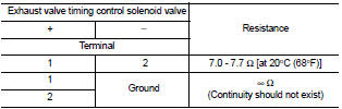 3. Check resistance between exhaust valve timing control solenoid valve terminals as per the following.