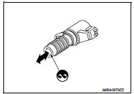 2. Provide 12 V DC between exhaust valve timing control solenoid valve terminals 1 and 2, and then interrupt it. Check that the plunger moves as shown in the figure.