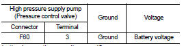 4. Check the voltage between high pressure supply pump (pressure control valve) harness connector and ground.