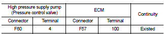 3. Check the continuity between high pressure supply pump (pressure control valve) harness connector and ECM harness connector.