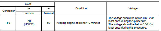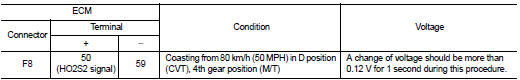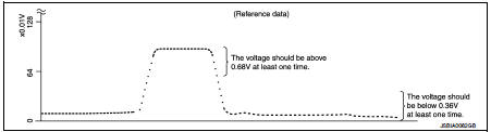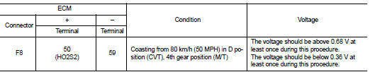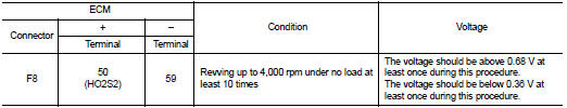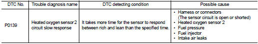 The heated oxygen sensor 2 has a much longer switching time between rich and lean than the air fuel ratio (A/F) sensor 1. The oxygen storage capacity of the three way catalyst (manifold) causes the longer switching time. To judge the malfunctions of heated oxygen sensor 2, ECM monitors whether the switching response of the sensor's voltage is faster than specified during the various driving condition such as fuel cut.