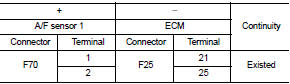 4. Check the continuity between A/F sensor 1 harness connector and ECM harness connector.
