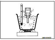 4. Check resistance between engine oil temperature sensor terminals by heating with hot water as shown in the figure.