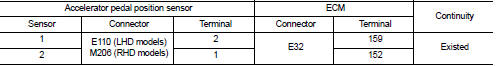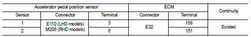 1. Check the continuity between accelerator pedal position sensor harness connector and ECM harness connector.
