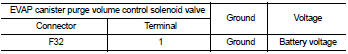 4. Check the voltage between EVAP canister purge volume control solenoid valve harness connector and ground.