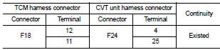 3. Check the continuity between the TCM harness connector terminals and the CVT unit harness connector terminals.