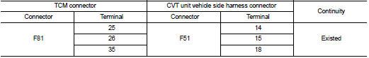 4. Check continuity between TCM vehicle side harness connector terminals and CVT unit vehicle side harness connector terminals.