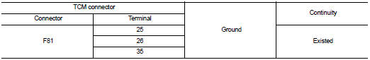 Check continuity between TCM vehicle side harness connector terminals and ground.