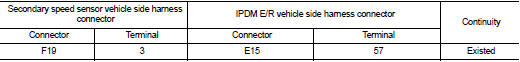 3. Check continuity between secondary speed sensor vehicle side harness connector terminal and IPDM E/ R vehicle side harness connector terminal.