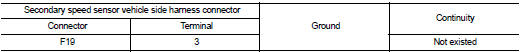 Check continuity between secondary speed sensor vehicle side harness connector terminal and ground.