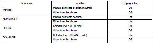 Drive the vehicle in the manual mode and shift lever to the “UP (+ side)” or “(− side)” side (1st ⇔ 6th gear).Check that the meter indicator coincides with the actual gear position.