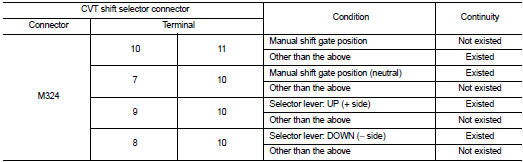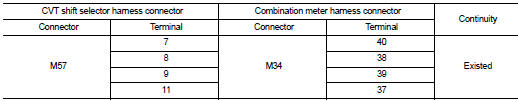 3. Check continuity between CVT shift selector harness connector terminals and combination meter harness connector terminals.