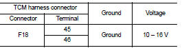 Check the following items: • Open or short circuit of the harness between battery positive terminal and TCM connectors terminals 45 and 46. Refer to PG-10, "Wiring Diagram - BATTERY POWER SUPPLY -".