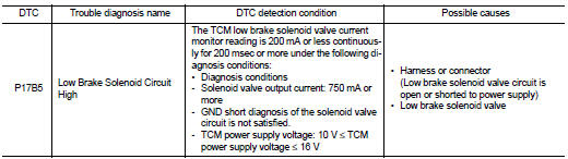 Check the low brake solenoid valve. Refer to TM-452, "Component Inspection (Low Brake Solenoid Valve)".