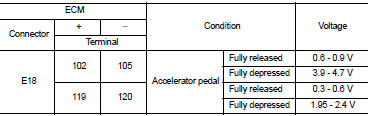 4. Check the voltage between ECM harness connector terminals as per the following condition.