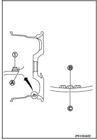 • When installing balance weight (1) to road wheels, set it into the grooved area (A) on the inner wall of the road wheel as shown in the figure so that the balance weight center (B) is aligned with the tire balance machine indication position (angle) (C).