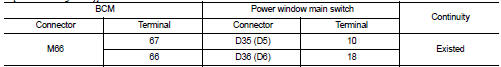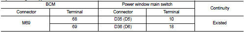 3. Check continuity between BCM harness connector and power window main switch harness connector.